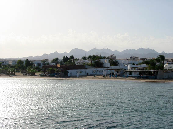 Nach dem Überfliegen der Arabischen Wüste, einem über 2000 m hohen Gebirge im Osten Ägyptens, setzt das Flugzeug kurz vor 14:00 Uhr Ortszeit zum Landeanflug an und allmählich erkennen wir im Dunst die Küste des Roten Meeres und verstreute Siedlungen im Wüstensand. Auf dem letzten Stück vor der Landung in Hurghada bekommen wir einen ersten Eindruck von oben über die Hotelanlagen und solche die es irgendwann vielleicht einmal werden wollen. |