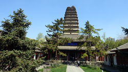 Wir reisen sehr bequem in der 1. Klasse und rasen mit streckenweise 300 km/h dem Ziel entgehen. Die rund 800 km bewältigen wir in gerade mal etwas über 4 Stunden. Draußen ist jetzt (leider) das erwartete chinesische Wetter, grau und nebelig. Angekommen in Luoyang regnet es sogar, was uns aber nicht davon abhält, gleich das erste touristische Ziel in Angriff zu nehmen. Wir fahren mit dem Bus zum Tempel des weißen Pferdes, welcher in mitten einer Parkanlage liegt. Der Tempelkomplex ist mit fast 2000 Jahren der älteste Buddhistische Tempel Chinas. Er ist dem weißen Pferd gewidmet, welches zwei indische Mönche und die Buddhistischen Schriften nach China trug. Neben dem Tempelkomplex können wir Nachbildungen berühmter Heiligtümer Indiens, Thailands und anderer asiatischer Länder besichtigen. |