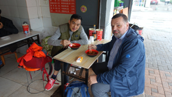 Auf dem Weg zum Ausgang kommen wir an einer langen Tischreihe im Freien vorbei, wo sich Einheimische nachmittags treffen, um Karten oder Mah-Jongg zu spielen. Solche Begegnungen werden wir nöch öfter auf der Reise haben. Zum Abendessen gehen wir in eine große Gaststätte gleich hinter unserem Hotel, das Essen ist sehr lecker und scharf. Wir sitzen alle an einem großen, runden, drehbaren Tisch und viele verschiedene Speisen werden auf Platten aufgetragen. Jeder nimmt sich, was er möchte. Dazu gibt es immer grünen Tee, der uns nicht schlafen lässt. Nachdem wir das einige Tage später begriffen haben, steigen wir auf Bier um. |
